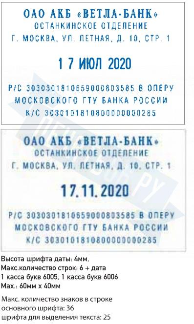 | Размер поля: 60 х 40 мм. Высота шрифта даты: 4 мм. |