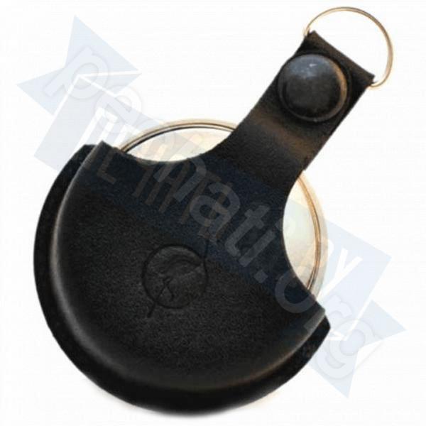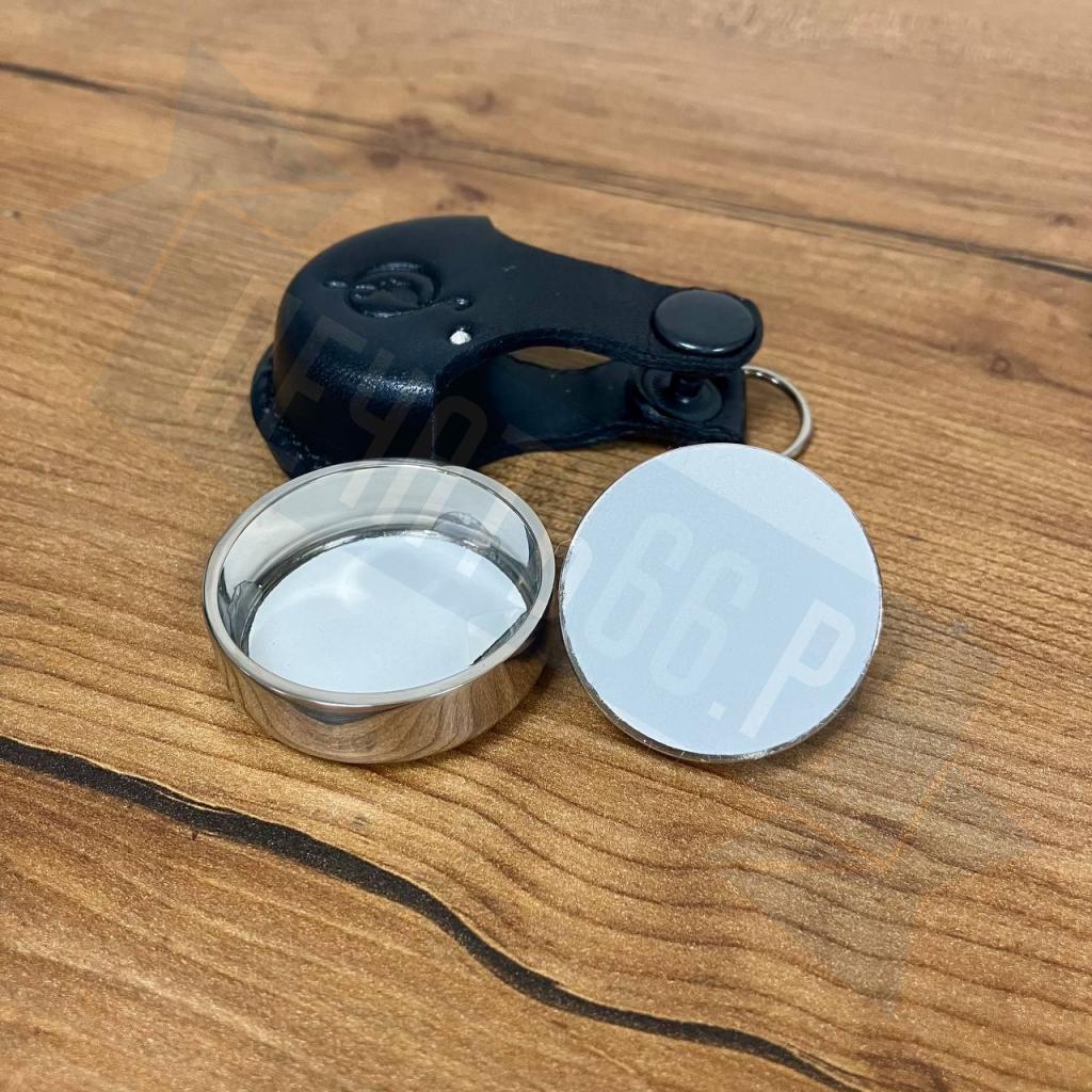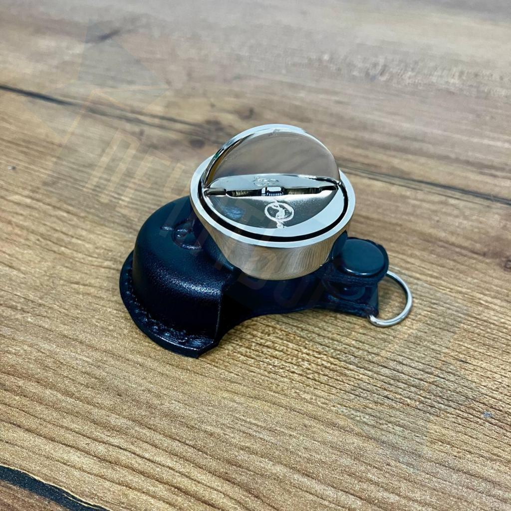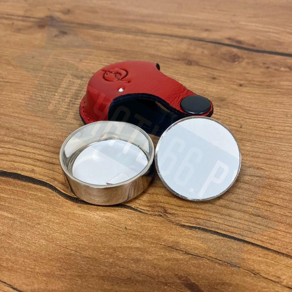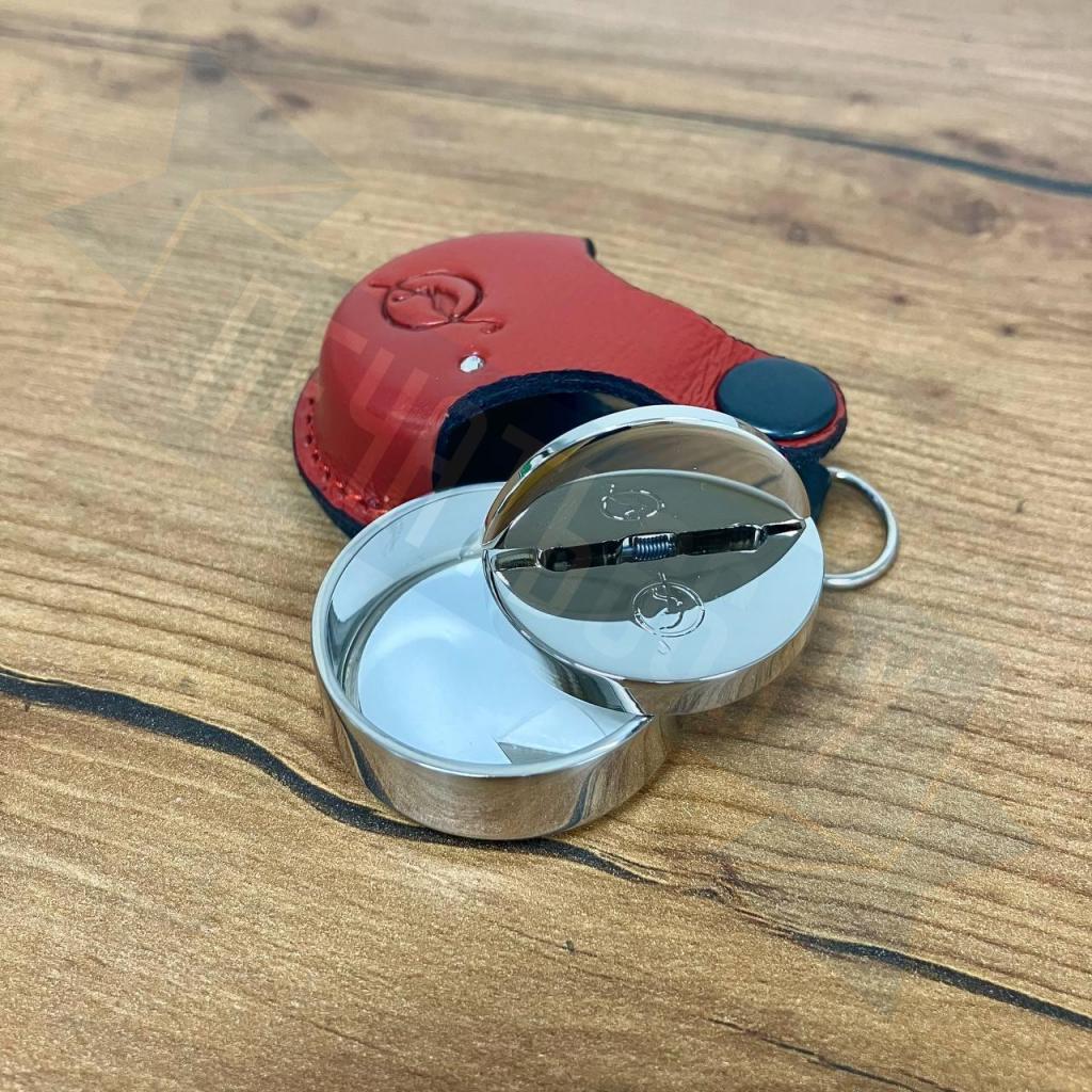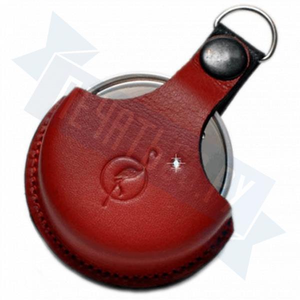 Карманная металлическая оснастка для круглой печати со встроенной штемпельной подушкой синего цвета, клеевым слоем для крепления клише печати. Никелированная. В комплекте чехольчик из натуральной кожи для возможности ношения на карабине.
