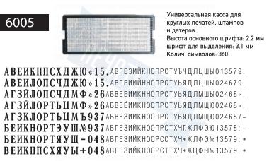| Универсальная касса для круглых печатей, штампов и датеров. Количество символов: 360. |